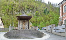 Aus Bruchsteinen gefügtes Denkmal am St. Leonhardplatz mit einer überlebensgroßen geschnitzten Soldatenstatue die durch ein pyramidenförmiges Dach geschützt ist, die Namenstafeln sind auf einer Betonwand daneben befestigt.