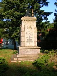 Das ca. 3 m hohe Denkmal aus hellem Stein steht auf dem Hof der Kirche. Es trägt eine Widmungs- und drei Namensseiten für die Gefallenen des 1. Weltkriegs der Gemeinden/Ortsteile Neschwitz, Quoos, Weidlitz, Wetro, Zescha, Lauske, Lissahora, Loga, Puschwitz, Saritsch, Uebigau, Krinitz, Jeßnitz, Holscha, Neudorf, Pannewitz, Brösern, Guhra, Luga und Miltwitz