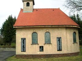 An einer kleinen Kirche sind drei Wandplatten angebracht, welche anstatt eines abgerissenen Denkmals an die Gefallenen des Ortes erinnern (Ul. Starokrecanska-Ortseingang Rumburk)