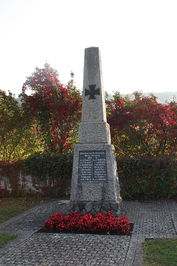 Im Friedhof: sich nach oben verjüngende Säule, Gedenktafeln an drei Seiten; zusätzlich Hinweise zu Soldaten von privaten Gedenksteinen