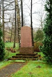 Das ca. 2 m hohe Denkmal aus rotem Stein steht an der Hauptstraße in der Mitte des Ortes.