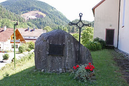 Bei der Kirche: Naturstein mit Gedenktafel und Kreuz