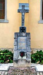 Gedenktafel an der Kirchenaußenwand und Denkmal gekrönt mit Kruzifix neben der Kirche.