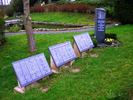 Vor dem Friedhofseingang befindet sich eine kleine Gartenanlage. Hier steht ein stelenartiger Widmungsstein, daneben drei Namenstafeln. Am Zaun befindet sich noch ein Hinweisschild mit weiteren 75 Namen, welche nicht auf den drei Tafeln angebracht sind.