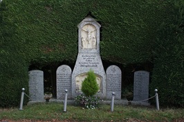 Bei der Kirche: 3-teiliges Denkmal, in der Mitte erhöht mit dachförmigem Abschluss und Bildrelief "Heiland am Kreuz und zwei weinende Frauen". Daran zwei Gedenksteine (1. Weltkrieg), links und rechts davon je ein Gedenkstein (2. Weltkrieg). Zusätzlich Hinweise zu Soldaten von privaten Gedenksteinen.