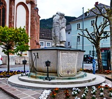 Zwölfeckiger ehemaliger Brunnen am Hauptplatz gekrönt mit der Statue dreier Soldaten.