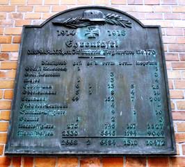 an der Außenwand der Stadtbibliothek eine kupferne Gedenktafel. Sie ist verziert mit einem Stahlhelm,