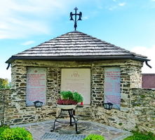 In die Friedhofseinfriedung integrierte, holzschindelgedeckte Kapelle mit Gedenktafeln.