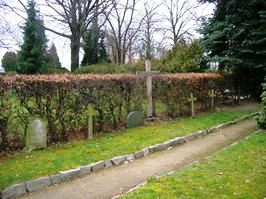 Kapelle: Sei getreu bis in den Tod, so will ich dir die Krone des Lebens geben Holzkreuze ohne Inschriften, Steine mit drei Namen und fünf Unbekannten