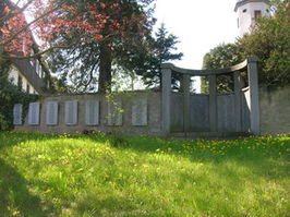 In der Friedhofsmauer befindet sich ein Halbrondell mit oben umlaufender Widmung und vier Namenstafeln für die Gefallenen des 1. Weltkriegs.