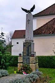 Stele auf Sockel gekrönt mit Adler neben der Kirche.