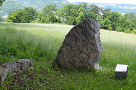 Am Waldrand oberhalb vom Ort ein Stein mit Metallplakette, seitlich ein weiterer Stein am Boden und eine Hinweistafel zur Grenzbrigade 5