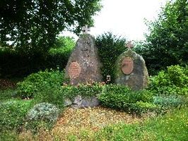 Zwei Sandsteinfindlinge mit einer eingefügten und einer aufgesetzten Metalltafel.