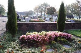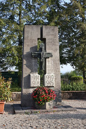 Im Friedhof: Betonwand, in der Mitte Metallkreuz, vorne und seitlich Namen; Kriegsgrab mit drei Kreuzen