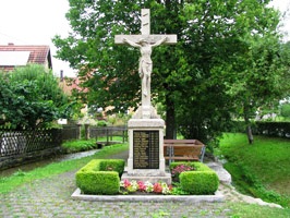 Rechteckiges Steindenkmal mit aufgesetztem Steinkreuz mit Christusfigur im Ortskern. Gravierte polierte