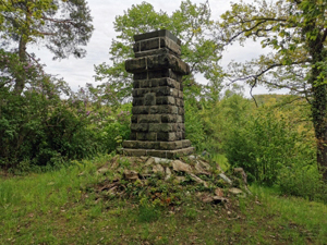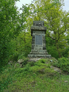 Namenlose, aus behauenen Natursteinen gemauerte Stele auf dem Deckgebirge über dem Rothenthaler Tunnel der Elstertalbahn. Die Namen der Gefallenen sind auf der Tafel an der Kirche zu Caselwitz verzeichnet.