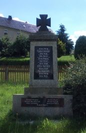 Steinquader auf 2-fach gestuftem Sockel mit Eisernem Kreuz als Abschluss. Keine Inschrift. Namen für 1. Weltkrieg in Reihenfolge des Sterbedatums.