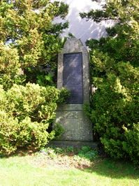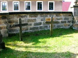 Vor der Kirche steht ein ca. 2,5 m hoher Gedenkstein mit den Namen der Gefallenen des 1. Weltkriegs; rechts vom Friedhofseingang stehen zwei Holzkreuze für Opfer der Endkämpfe des 2. Weltkriegs.