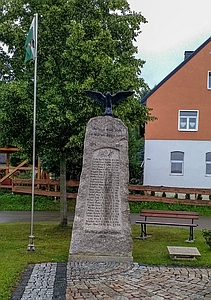 1928 errichtet. Feldsteinartiges Denkmal aus grauem Granit. Es war ursprünglich von einem fliegenden Adler gekrönt und stand in einer kleinen Grünanlage. 1972 wurde es wegen Bau einer Buswendeschleife beseitigt und vergraben, 2001 wieder aufgestellt und 2016/2017 wurde das Denkmal renoviert. Dabei erhielt es wieder einen krönenden Adler. Die Namensliste auf geglätteter Oberfläche in der Mitte, ist seit der Renovierung wieder sehr gut lesbar. Eine weitere Gedenktafel für die Gefallenen des Zweiten Weltkriegs wurde neben dem Ehrenmal installiert.