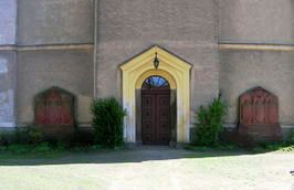 Beidseits des Einganges zur Kirche befindet sich je eine große Wandplatte aus rotem Stein.