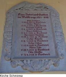 In der Kirche von Schmirma befindet sich eine schlichte Steintafel, die die Namen der Gefallenen enthält. Sie wird mit einem Eisernen Kreuz abgeschlossen. Oben ist ein Adler, der eine Schlage niederringt.