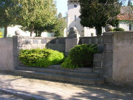 In der Friedhofsmauer vor der Kirche gibt es eine halbkreisförmige Ausbuchtung. Mittig ein Stein mit Widmung und Stahlhelm. Beidseits an der Mauer sind die Namenstafeln der Gefallenen angebracht.