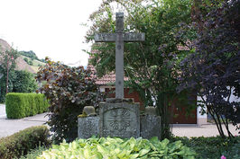 Bei der Kirche; Denkmal mit Kreuz, links u. recht zwei Stahlhelme, ohne Namen