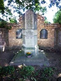 die Namen der Gefallenen des 1. Weltkrieges. Hinter dieser Säule an einer Ziegelwand drei Tafeln mit den Namen
