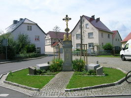 An der einzigen Straßenkreuzung befindet sich auf einem Steinsockel ein gekreuzigter Jesus. Um diese Figur sind vier flache Gedenksteine angeordnet, je zwei für den 1. und 2. Weltkrieg. Alle Inschriften sind in sorbischer Sprache.