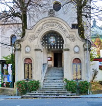 Gedenktafeln auf einem Torbogen über dem Aufgang zur Kirche.