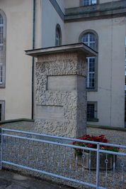 Vor dem Rathaus steht ein ca. 3 m hoher weißer Sandsteinquader. Er zeigt ein künstlerisch gestaltetes Relief und eingemeißelte Namen der Gefallenen des 1.Weltkriegs. Leider ist eine komplette Längsseite völlig verwittert und unleserlich.