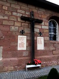 Die Gedenktafeln mit den Namen der Gefallenen und Vermissten beider Weltkriege hängen an der Außenwand der Kirche.