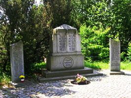 Mittig steht ein fast quadratischer Stein mit Namen der Gefallenen des 1. Weltkriegs, beidseits ein
