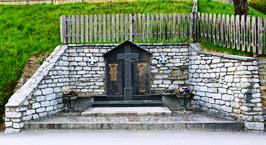 Schwarze Marmorplatten und ein Kreuz vor einer aus Natursteinen gefügten Stützmauer neben der Kirche.