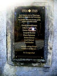 St. Georgenthal (Jiretin pod jedlovou), Schluckenauer Zipfel, Bezirk Tetschen, TschechienAn der Friedhofsmauer innen rechts vom Eingang befindet sich eine ca. 60 x 25 cm große Wandplatte