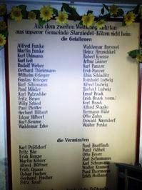 Aus dem zweiten Weltkrieg kehrten aus unserer Gemeinde Starsiedel-Kölzen nicht heim: die Gefallenen (Namen) die Vermissten (Namen) Wir müssen durch viele Trübsale ins Reich Gottes eingehen.
