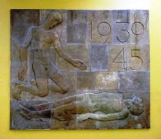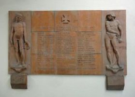 1. Weltkrieg IM KRIEGE 1914-18 SIND FÜR DAS VATERLAND GEFALLEN: (Namen) Unter den Namen ein altgriechischen Text, welcher übersetzt lautet: „Sie sind dort gestorben, wo es für junge Menschen schön ist zu sterben“;