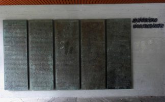 Unbekannte Künstler errichteten fünf Gedenktafeln (Einweihungsfeier 1961) an der Wand der Pausenhalle des Dillmann-Gymnasiums in Stuttgart.