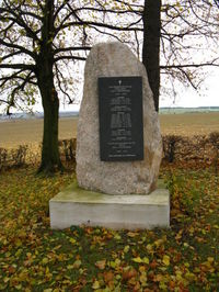 Der Findling mit Namenstafel auf Betonsockel steht außerorts nord-östlich der