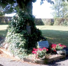 Auf dem Friedhof steht ein efeuumwucherter Feldstein. Auf zwei Tafeln sind die Namen der Gefallenen der beiden Weltkriege genannt,