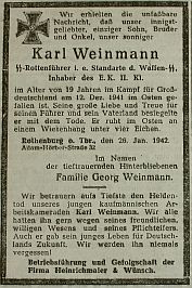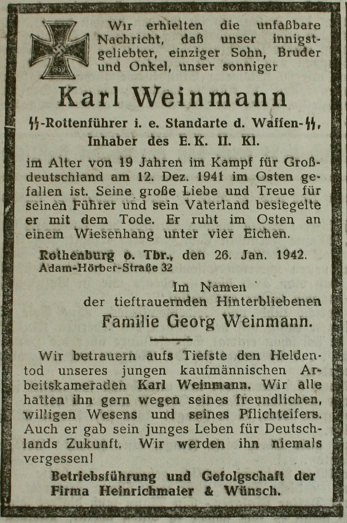 Wir erhielten die unfaßbare Nachricht, daß unser innigstgeliebter, einziger Sohn, Bruder und Onkel, unser sonniger Karl Weinmann im Alter von 19 Jahren im Kampf für Großdeutschland im Osten gefallen ist.
