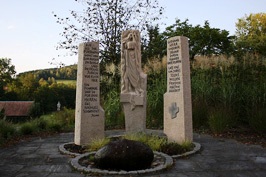 Beim Gemeindeamt: drei aufrechte Steine und davor ein ovaler Stein als Brunnen, mittlerer Stein mit Bildrelief