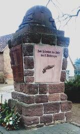 Aus Buckelquadern viereckig, sich nach unten verjüngendes Denkmal. Stilisierter Stahlhelm als oberer Abschluss. Namenstafeln an den Seiten. Ehrentafel aus stabiler Kartonage mit Fotos einzelner Personen. Die Gefallenen sind in der Mitte in einem schwarzen Eisernen Kreuz angebracht. Die anderen sind womöglich Kriegsteilnehmer.