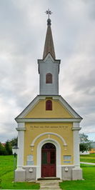 Wandplaketten an der Außenwand der Dorfkapelle.