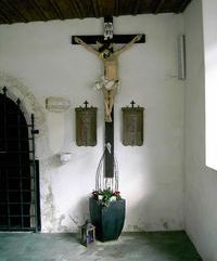 Im Vorraum der Pfarrkirche rechts vom Eingang zur Kirche Gekreuzigter und zwei Holztafeln mit den Namen der