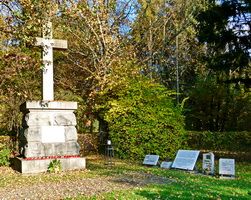 Steinkreuz auf Natursteinsockel daneben fünf kleinere Gedenktafeln.