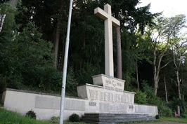Am Waldrand ca. 300-400 m links oberhalb vom Zoo: lange dreistufige Mauer und darüber Hochkreuz, Inschrift und Namenstafeln vorne. Zusätzlich Hinweise zu Soldaten von privaten Gedenksteinen