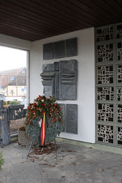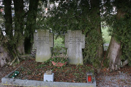 Im Friedhof; Gedenktafeln an der Abdankungshalle; Soldatengräber mit zwei Steinkreuzen; zusätzlich Hinweise zu Soldaten von privaten Gedenksteinen.