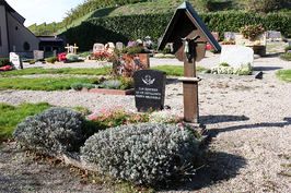 Im Friedhof ein Soldatengrab mit Gedenkstein und Holzkreuz; zusätzlich Hinweise zu Soldaten von privaten Gedenksteinen