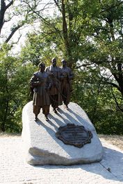 Wien-Döbling (Leopoldsberg, ukrainische Kosaken), ÖsterreichPLZ 1190 Am Parkplatz am Leopoldsberg; Stein mit drei Kosaken und Gedenktafel zur Erinnerung an die Zweite Wiener Türkenbelagerung
